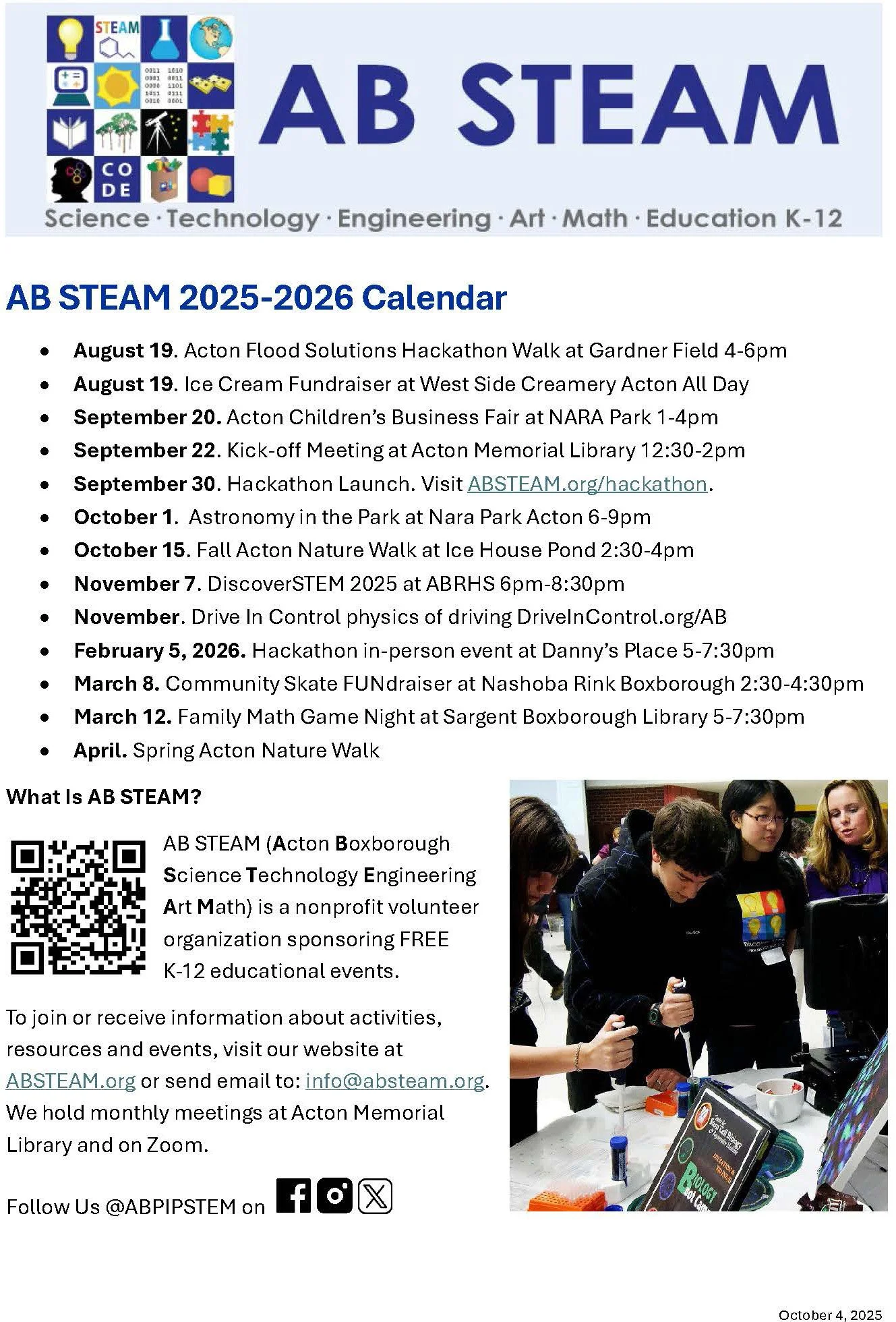 Our nonprofit organization sponsors FREE STEAM EVENTS for students, parents, guardians and volunteers in the Acton-Boxborough community.