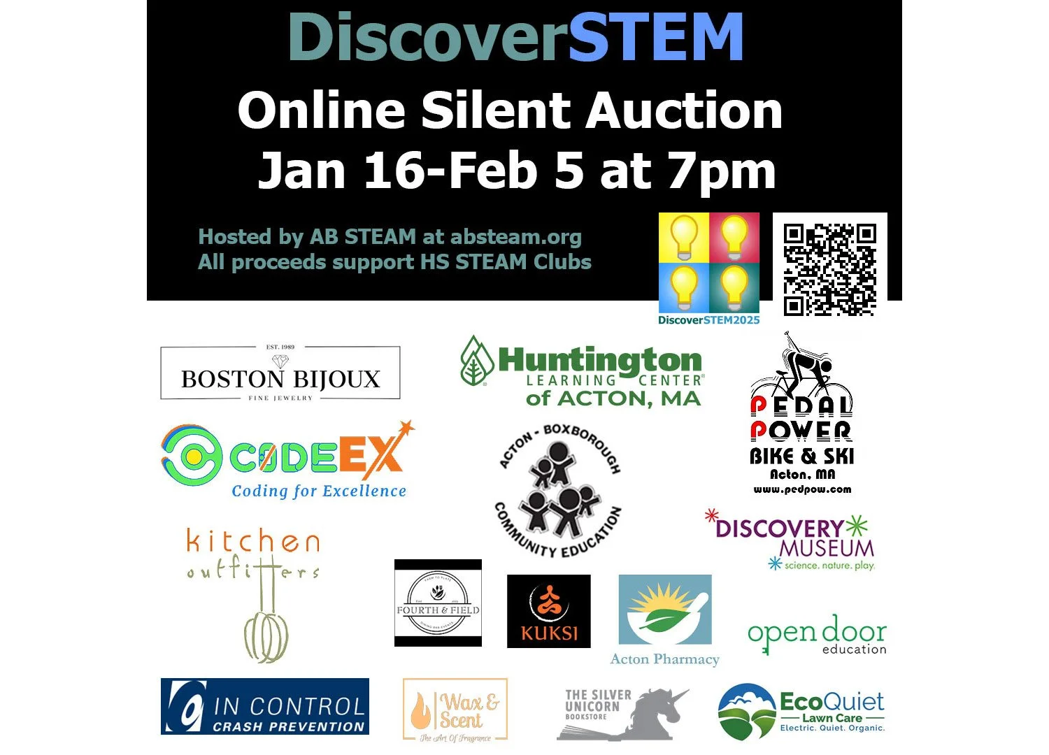DiscoverSTEM 2025 Thank you for joining us at DiscoverSTEM 2025 for an evening of career exploration in Science, Technology, Engineering and Math on Friday, November 7 from 6:00 to 8:30 PM at Acton-Boxborough Regional High School. Read the story in the Acton Exchange and the thank you article in the Acton Unlimited. See our DiscoverSTEM 2025 Sponsors Page and Photo Gallery. The Online Silent Auction has been postponed until January 16, 2026. For info, send email to discoverstem@absteam.org. DONATE TO DiscoverSTEM