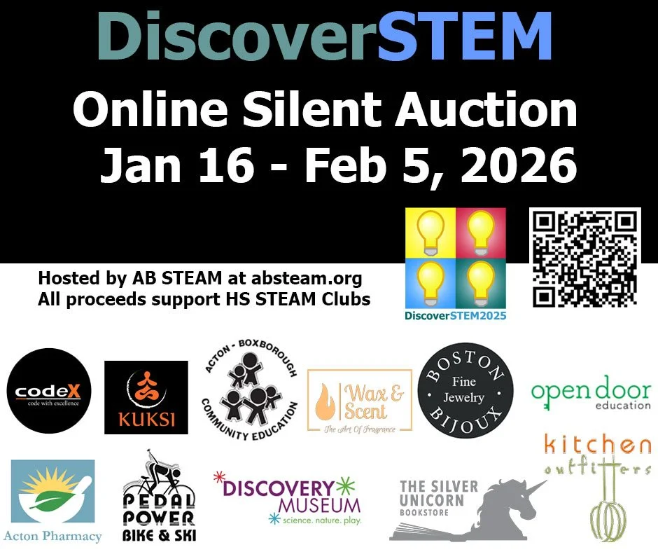 AB STEAM Online Auction Friday, January 16, 2026 8:00 AM Thursday, February 5, 2026 7:00 PM Google Calendar ICS The AB STEAM Online Auction will run Friday, 1/16/26 through Friday 2/5/26 at 7pm. All proceeds will benefit AB High School STEAM Clubs. Come back soon for details.