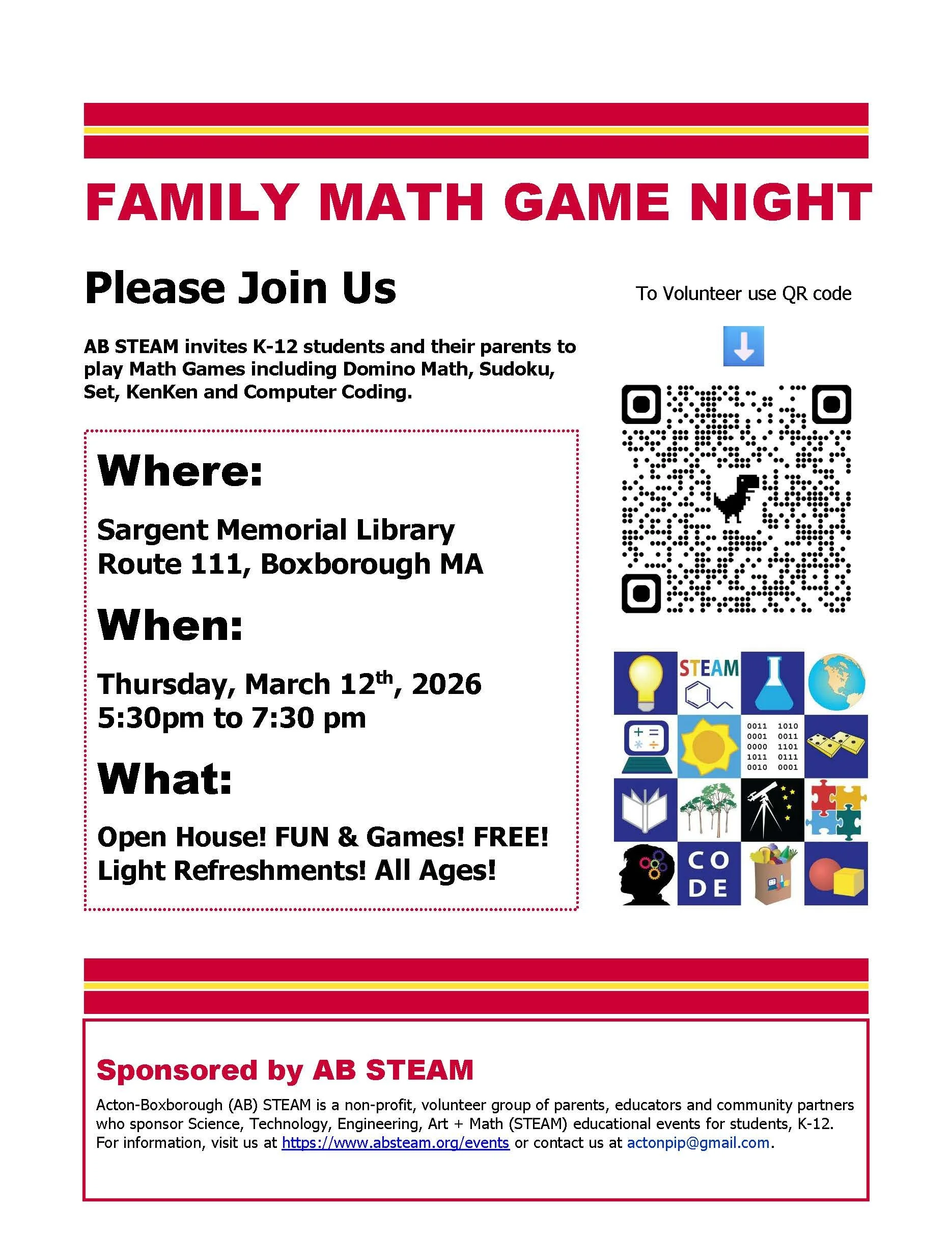 We provide the dominos and instructions for domino math and other games, such as, KenKen, Sudoku and paper-based computer coding games. Students in grades 7+ can volunteer to help younger children learn the math games.