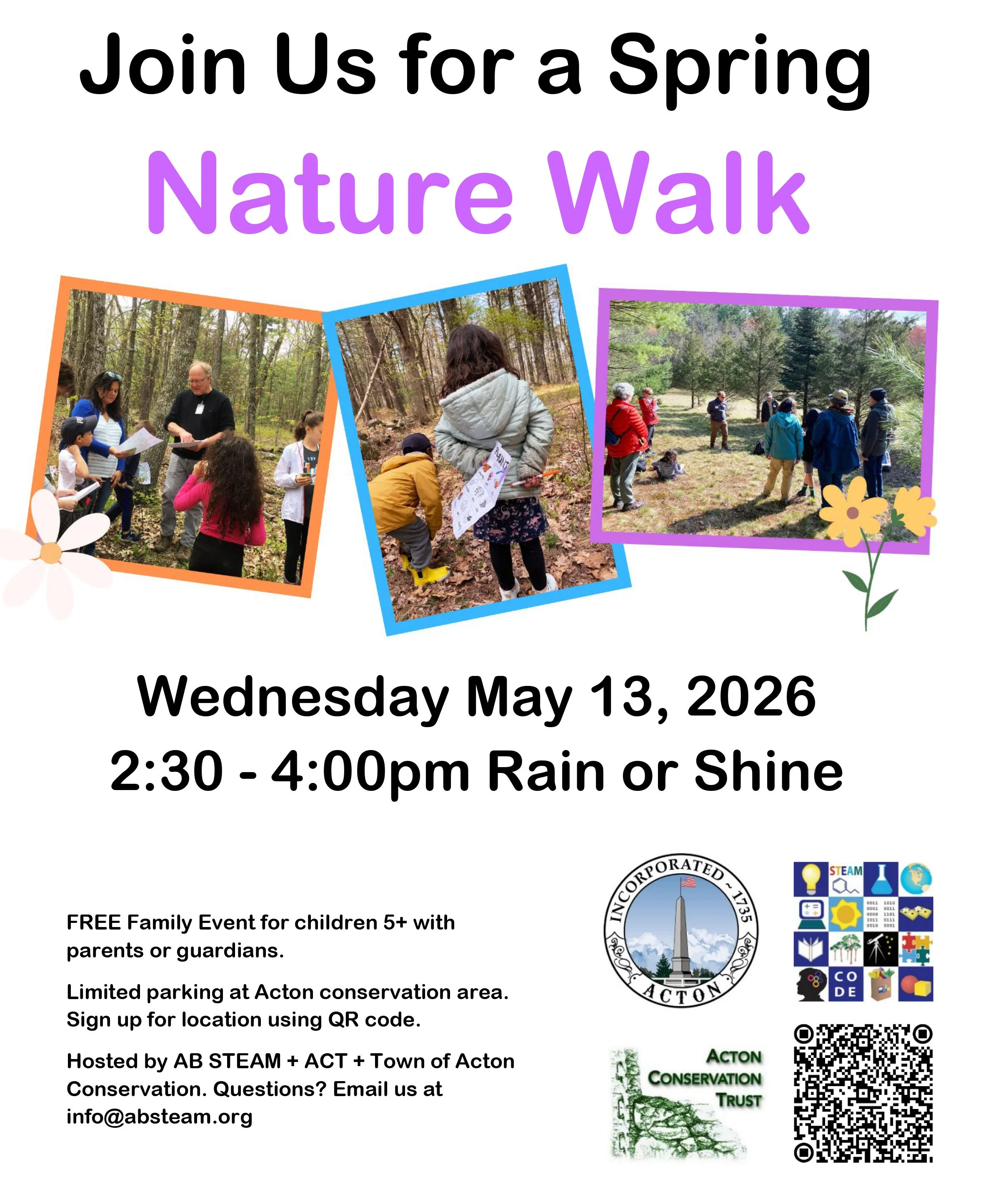 Every fall and spring, we sponsor nature walks in one of Acton's Conservation areas. Please join us for a FREE Guided Nature Walk with our guide. Enrollment is limited. This is not a drop-off event; children must be accompanied by an adult, but siblings are welcome. Limited parking; Sign up here for the location.